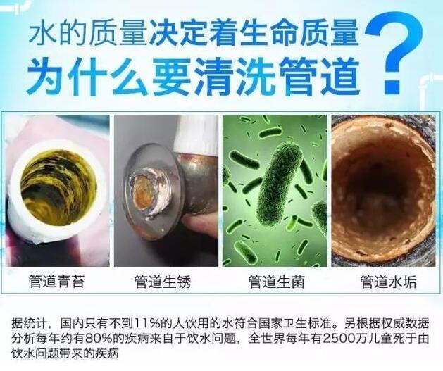 都说今天的饮水习惯,将决定着10年后自身的健康状况。自来水是目前对老百姓来说最经济实惠的供水渠道,但免不了会存在着一些问题,老化自来水管中的铁锈污垢、细菌微生物、杂质等都会对水质产生影响,就算煮沸后很多病毒也不能去除。定期清洗水管,减少管道二次污染,把住生活用水最后一公里的防线,才能让你和家人喝上健康水、放心水。